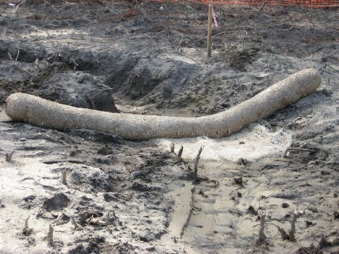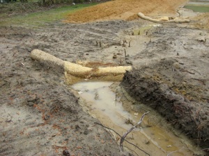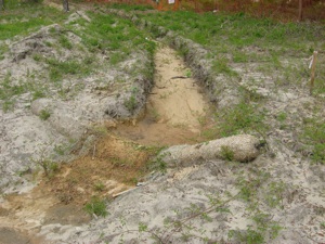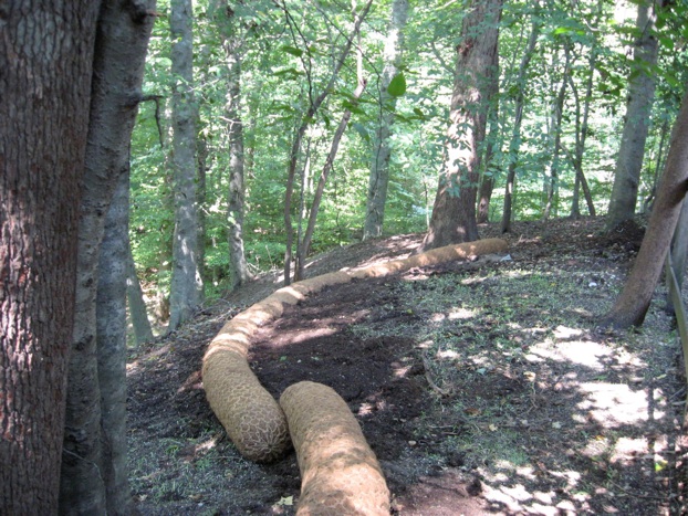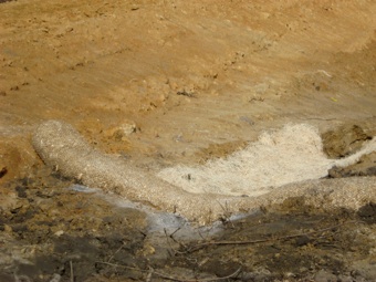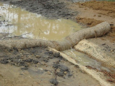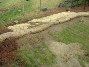 Above are waddles which now replace most “rock check dams”. Once charged with “Pam” they do an amazing job of cleaning up storm water run off, if they are installed right. The advantage? No equipment needed to install except a shovel and hammer, no removal necessary since these waddles will trap grass seed and eventually become a mound of grass, or can be moved and reused after short periods of time to allow re-grading, much lower liability, delivered in a pickup instead of a tandem dump truck.